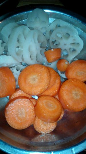 将莲藕去皮,洗净,切片,胡萝卜洗净,切片,要切厚一点,这样多出来比较完整,好吃