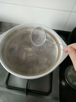 待砂锅水开了,煮一会,用漏勺撇去浮沫,这样汤会更清澈。然后加两勺盐盖上盖子用小火煮一个小时