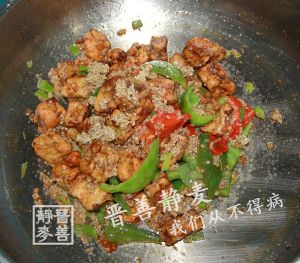 再在油锅里放入五花肉丝炒香,依次再放入黄豆酱油,生抽,一点醋已经白糖炒制,最后放入炸好的茄子块,加盐和鸡粉炒均匀