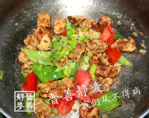 油量要大,茄子吃油!小火翻炒,快熟时候放西红柿和青椒