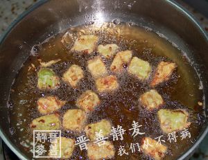 平底锅多倒些油热锅后放入裹好的茄子炸至变黄、变软,捞出备用