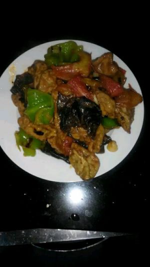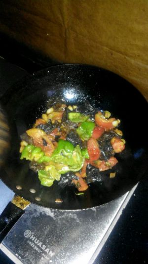 加入青椒黑木耳继续炒 放点生抽
