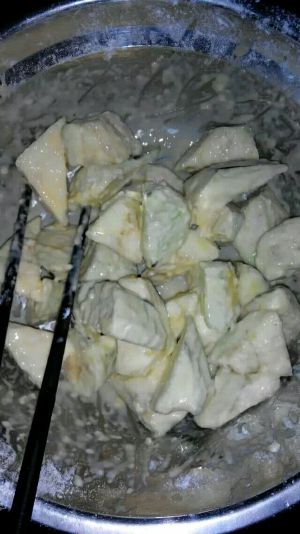 把茄子去皮切滚刀块,均匀撒上面粉,把鸡蛋打散裹上茄子,就是上浆啦!怎么顺手怎么来