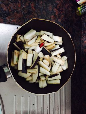 下茄条,加生抽、老抽(少许上色即可)、豆瓣酱(黄豆酱也可以)、糖,加少许水焖。