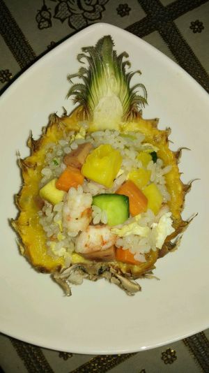 热油炒鸡蛋,盛出,再热油炒葱花,然后放入虾仁,火腿,萝卜,黄瓜,鸡蛋,最后放米饭中火炒散,加盐,出锅放菠萝,鸡精。