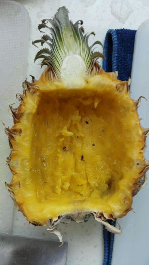 把菠萝用刀挖出果肉,切丁备用!