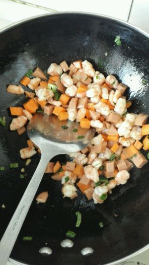 倒入菠萝和虾肉。因为红肠略咸我就没放盐,大家这时可以尝一下酌情放盐。
