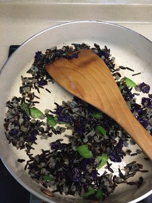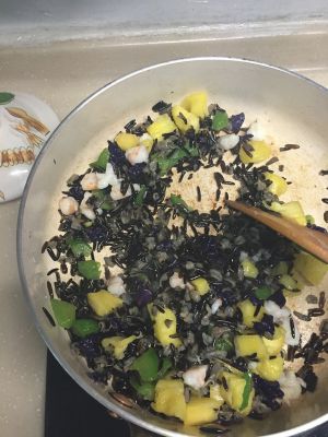重新启锅,放油,把之前减下来的虾头倒进油锅煸出虾油,放入葱末爆香,倒入胡萝卜,炒胡萝卜的空可以把虾头挑出来。然后放入米饭,煸炒一会放入鲜虾,虾变色后倒入菠萝,炒好的鸡蛋,米饭炒至米粒成单颗并且米粒饱满,放盐调味,