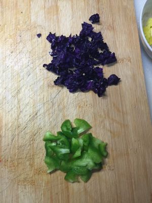 锅内倒油,依次在锅内放入葱花 胡萝卜 火腿 黄瓜 豌豆 鸡蛋翻炒