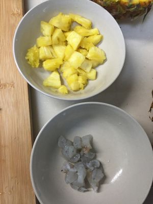 我买的菠萝带皮,没在水果摊处理。买回来对半切开,用刀子和勺子将一半的菠萝肉挖出来,切丁,如果米饭少可以用四分之一的菠萝,不然酸甜味会太重,切好的菠萝可以不用盐水泡。