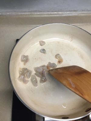 开火锅里放入适量的油,微热放入切好的虾仁丁炒变色,打出备用。