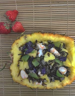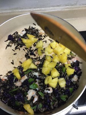 将蒸20分钟后的糯米拿出趁热绊在果肉里并加上枸杞和葡萄干,装入菠萝壳里盖上盖子上锅蒸15分。