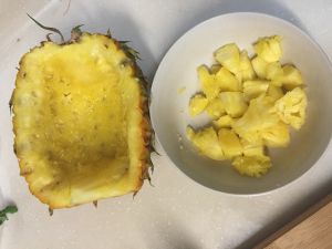 菠萝切十字刀花,取出菠萝肉,挖成碗形备用