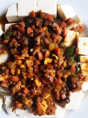 蛋黄压碎、和香菇黄瓜火腿丁还有肉末一起拌匀后倒入香油、咖喱粉、椒盐、生抽,放微波炉中火叮一分钟后取出覆盖在装好盘的豆腐上即可。