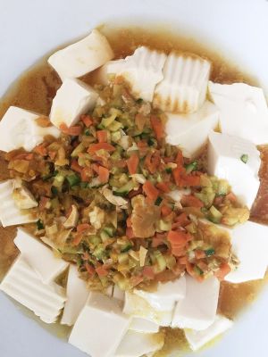 放置一小会,料汁很快会包裹整块豆腐,吃的时候搅拌均匀。荤素搭配营养美味。