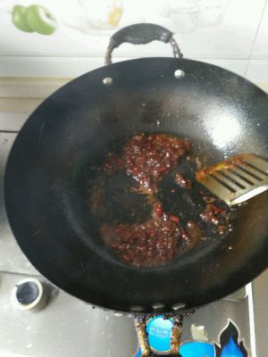 锅烧热,倒入牛肉酱。不需要另外加油。