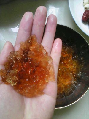 泡发好的桃胶,泡桃胶的途中多换几次水,桃胶有很多杂质会随着换水被清理掉