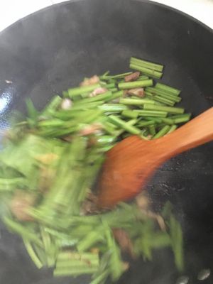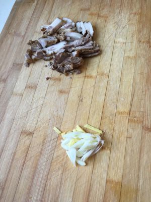 锅烧热放油,放入肉丝炒熟(怕肉腥气就在油热后先放两片姜爆香后再放肉丝)