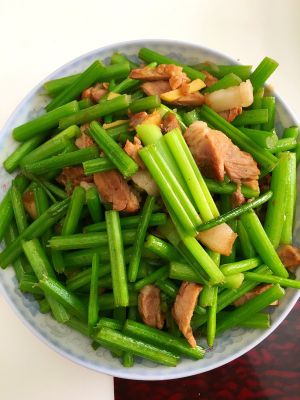 肉丝炒熟后放适量盐和糖,放入焯过水的芹菜大火翻炒至出香(最好放小半勺鸡精,味精就不要放了,身体很难代谢对健康是有影响的)