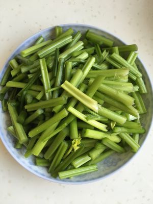 锅中放入一大碗水,烧开后倒入芹菜段,焯到芹菜快熟透捞出(焯水是为了去除芹菜的土腥气)