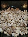 选上好的五花肉,要记得多买一块猪皮哦,这样煮出来的汤汁,才会有点粘稠感呀。。。口感就更好啦。。。 整块五花肉洗干净,和一大块猪皮一起捞去血水,然后冷水下锅,煮熟煮透。。。拿起来趁热把猪皮切成丁,还有五花肉切成小块。。。就像这样。。。猪皮要趁热切哦,不然硬了不好切啦,偶的手手被烫死了 1切好的猪皮,晶莹剔透,漂亮吧。。