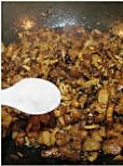 放入少许白糖,翻炒,再放入香菇碎、炸好的红葱头和海米碎,最后放入少许盐,翻炒均匀