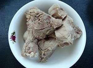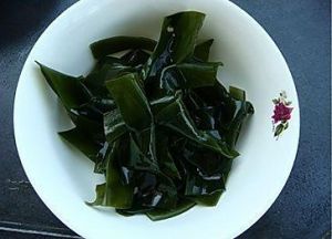 大骨头洗净放入砂锅中,加冷水没过骨头,盖盖开火烧。剪适量干裙带菜开水泡发。