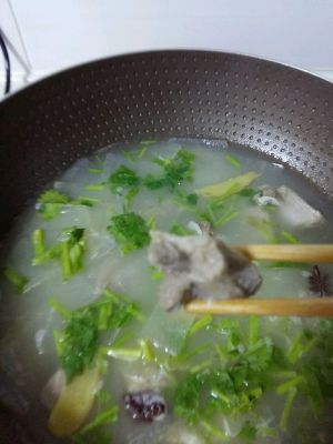 1 凉水放入葱姜八角 把排骨放入紧下 2锅放几滴油 放入葱姜八角 翻炒出香味放入排骨煸炒 3放入水 多一些 放盐味精十三香调味 4待排骨松软之后放入冬瓜 5待冬瓜透明后放入鸡精 感觉好了关火放入香菜 完成