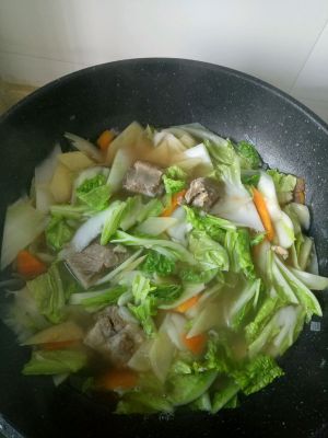排骨在锅里烧一下,添水煮依次放菜,我先放的是胡萝卜,圆葱,马铃薯,最后放的白菜。(白菜.马铃薯.胡萝卜都是自己种的