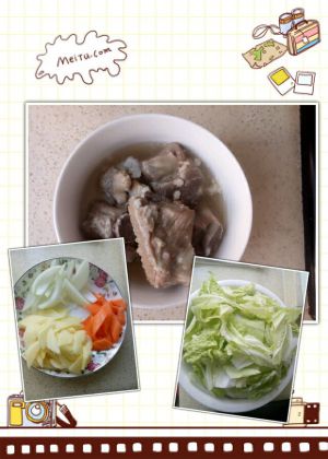煮好的排骨,菜切好白菜,胡萝卜,马铃薯,圆葱