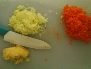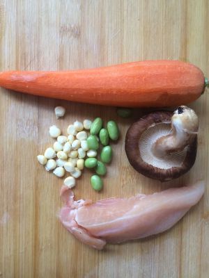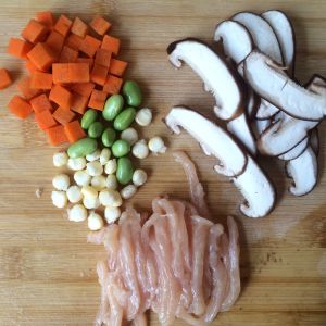 鸡胸肉顺着纹路切丝,香菇切薄片,胡萝卜切丁,玉米粒和青豆粒