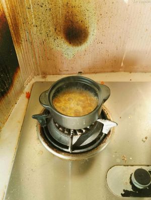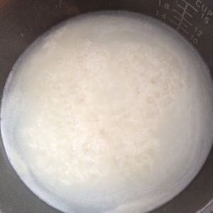 大米淘洗干净,放入煮鸡肉的汤锅里。