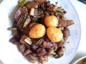 锅上坐油,花椒炸后捞出,下腌制约20分钟后的羊肉,快速翻炒约2分钟后倒入黄酒继续翻炒,如羊肉较粗或肉片较厚可加水焖一会
