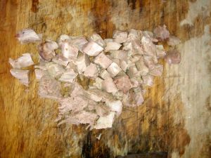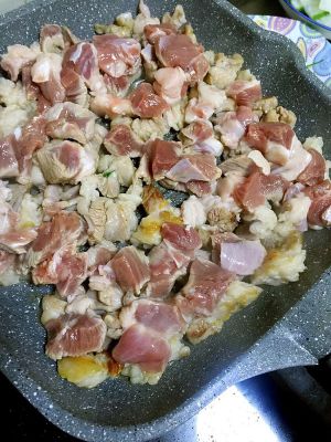 羊肉块把带肥油的一面朝下码放在平锅里,码好后开小火断生并焙出油,把羊肉块盛出。