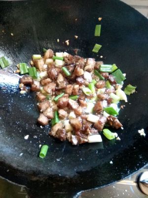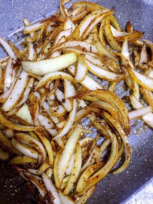 用焙羊肉的底油煸炒洋葱,加入酱油、盐、孜然粒翻炒,不要炒太长时间。