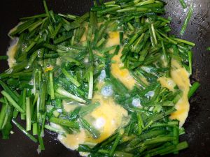 倒入煎好的鸡蛋,加盐花椒继续翻炒,加盐,鸡精,三五分钟即可不然韭菜就水了