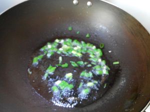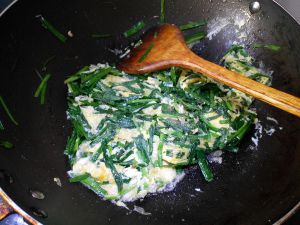 锅内放油,七八成热放入韭菜后迅速将蛋液倒入快速翻炒。