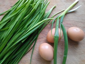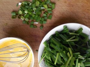 小葱切碎,鸡蛋加少量清水用手动打蛋器打散缙云。韭菜切段待用。