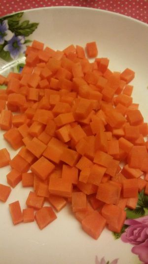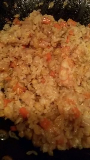 开始炒了 1放油以后,炒虾仁鱿鱼,然后捞出 2放油炒熟胡萝卜,然后放玉米 3放熟虾仁鱿鱼,放适量生抽,鸡精 4放冷米饭 5放打散的鸡蛋