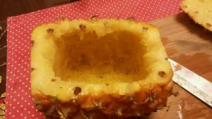 将菠萝去盖,大约在三分之一的地方。将菠萝肉取出,用勺子将菠萝掏空用盐水浸泡一下。