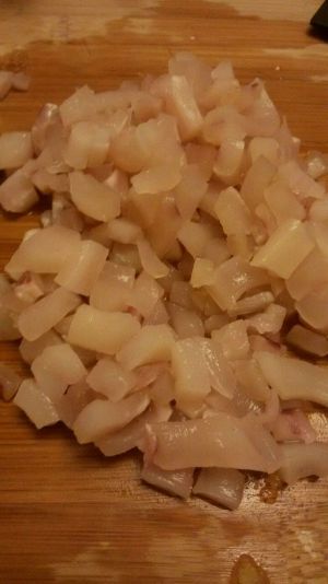 菠萝三分之一处切开,掏出里面的菠萝 所有的材料切丁
