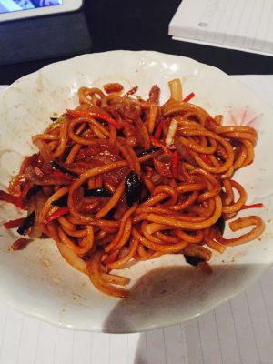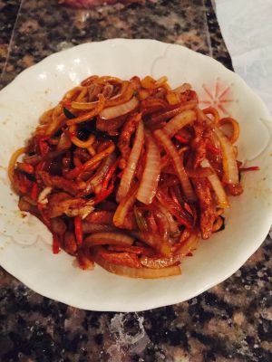 热油 下葱姜爆香 然后下里脊丝爆炒 再倒入洋葱和胡萝卜丝 加入盐和十三香 之后面条入锅翻炒 倒入海鲜酱油翻炒后 少量草菇老抽上色 出锅前撒一点点味精~