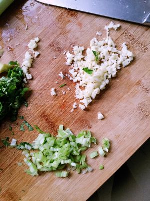 准备蒜蓉,葱末,香菜末。蒜蓉一部分下锅炸至金黄色备用。