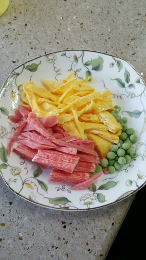 鸡蛋打撒 摊成薄饼切条 火腿切丝 蟹棒切段