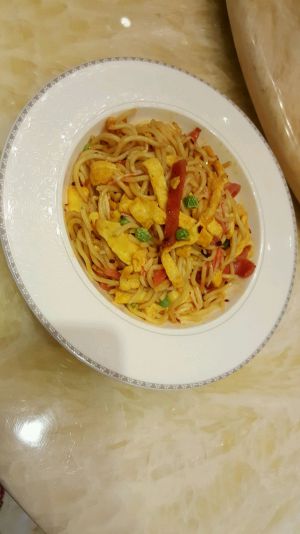 面条煮八分熟 捞出沥水 锅内倒少许油 放入火腿 蟹棒 青豆 翻炒 放入面条继续炒 放一小勺老干妈酱 放鸡蛋 倒少许海鲜酱油 炒匀 即可 不用放盐
