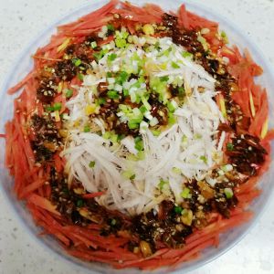 加麻油、盐、糖、醋、生抽拌匀。最后撒上花生碎。