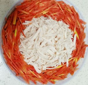 鸡肉煮好放凉,用果语不加头摇成丝绒状。