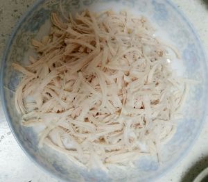 将煮熟的鸡丝用刀背捶捶,撕成细丝。