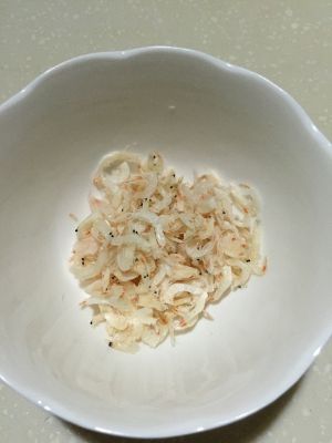 将控干水分的萝卜丝和虾皮混合均匀,加少许盐、色拉油调匀备用。虾皮中含有盐分,放盐的时候要注意少放,可以尝尝再加。也可以加些香葱,我是家里正好没有,嘿嘿。