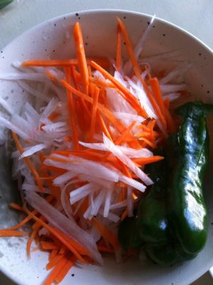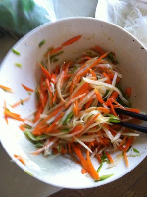 萝卜檫丝,放盐和胡椒(黑白均可)腌制十分钟左右,把杀出的水毕掉,可以再补些盐和胡椒,加些橄榄油,香葱拌匀即可